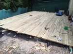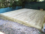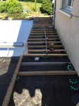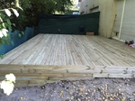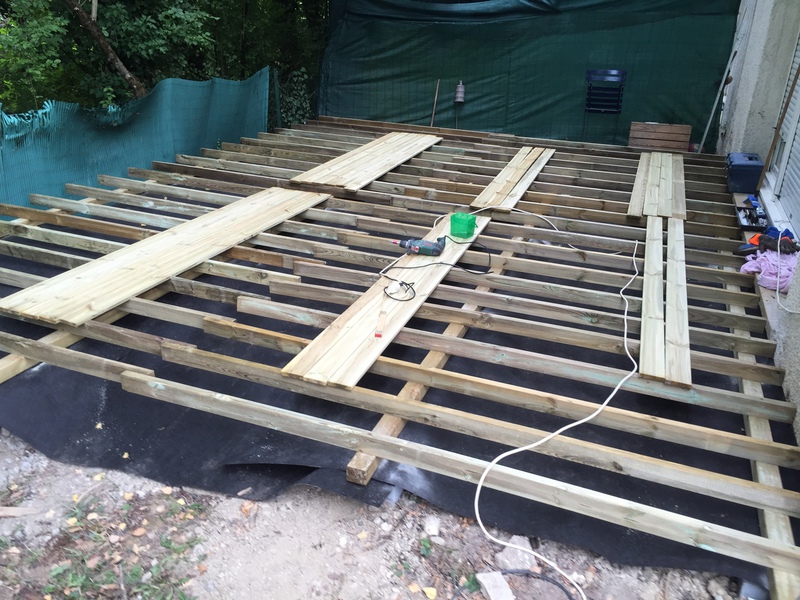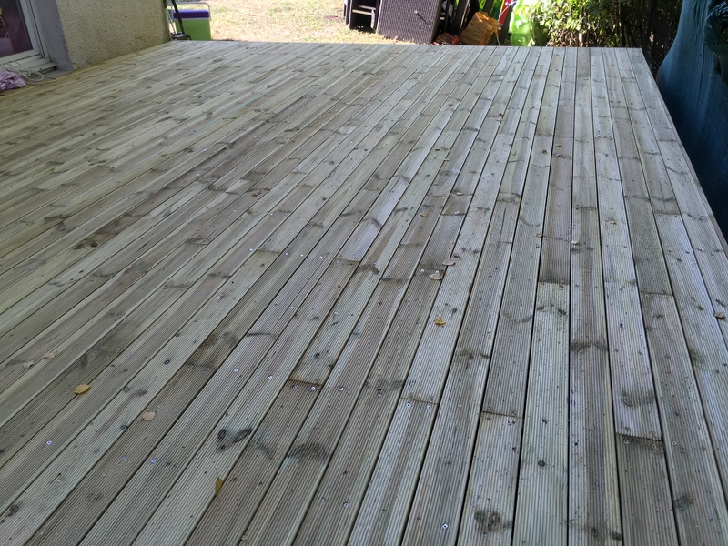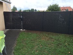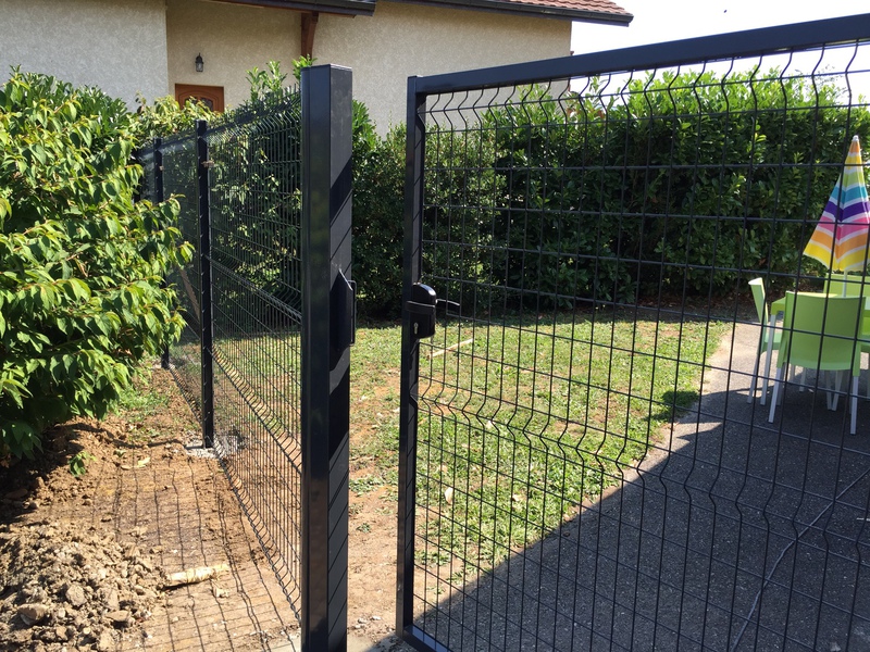 Travaux extérieur Genève savoie Ain. Clôture panneaux rigides avec portillon d'un terrain avec habitation, création d'une terrasse bois en pin autoclave. Création et rénovation d'une terrasse en bois