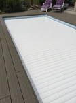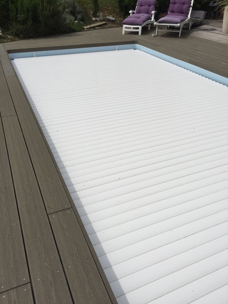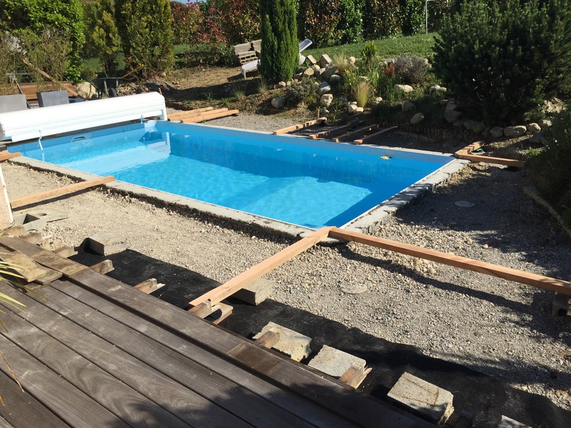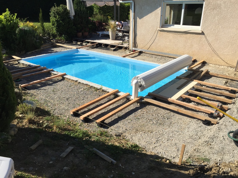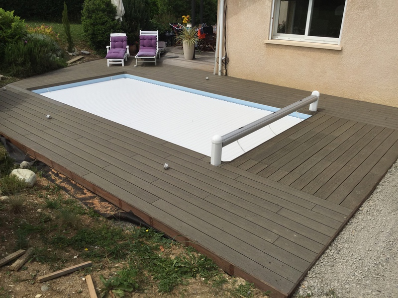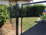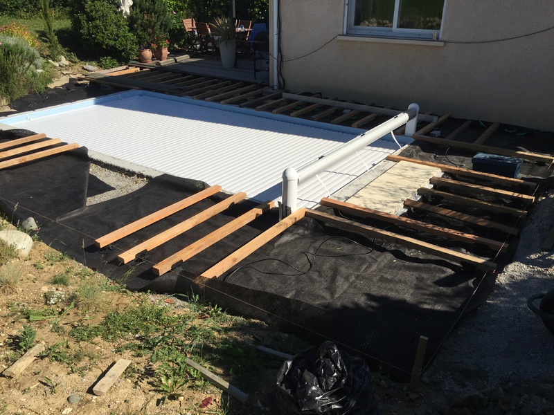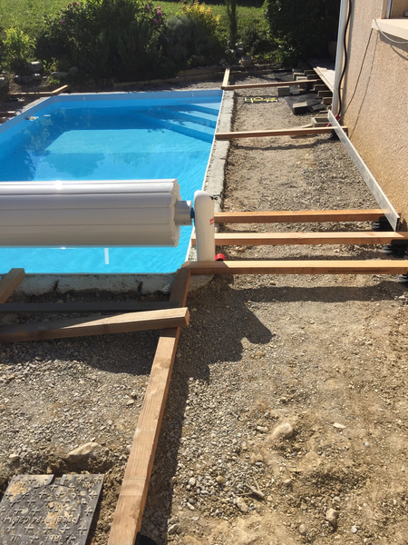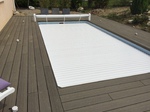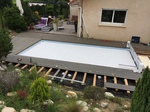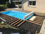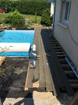 composite autour d'une piscine, lames posées sur lambourdes en bois autoclave à Eloise. Pose d'une clôture en panneaux grillage rigide avec occultation et portillon passage large. Réalisation d'un