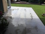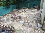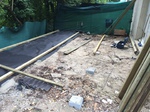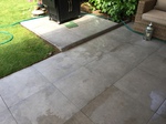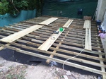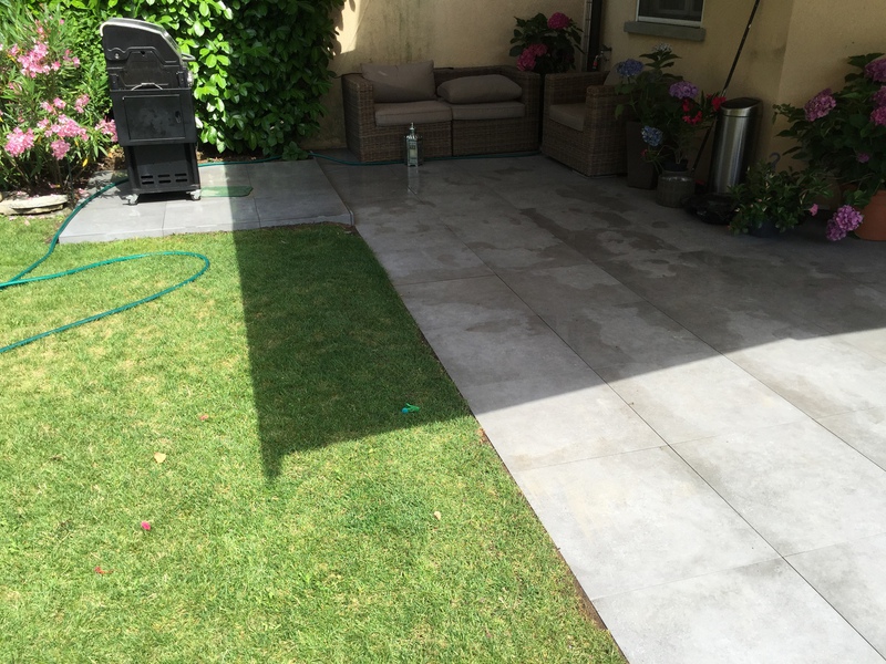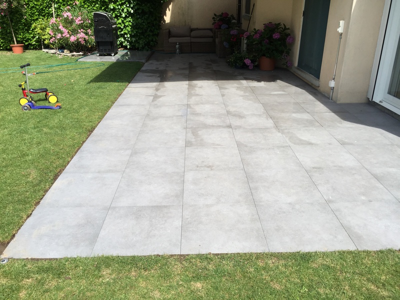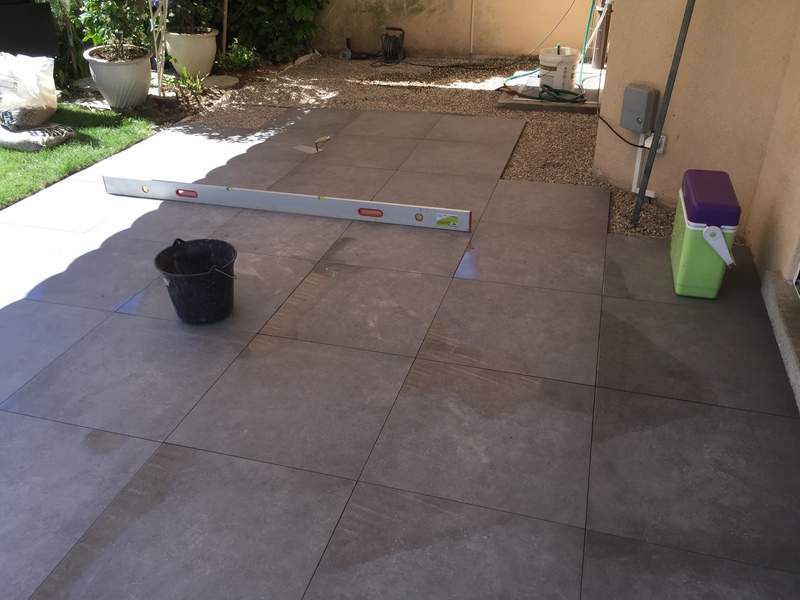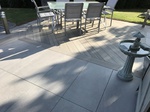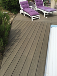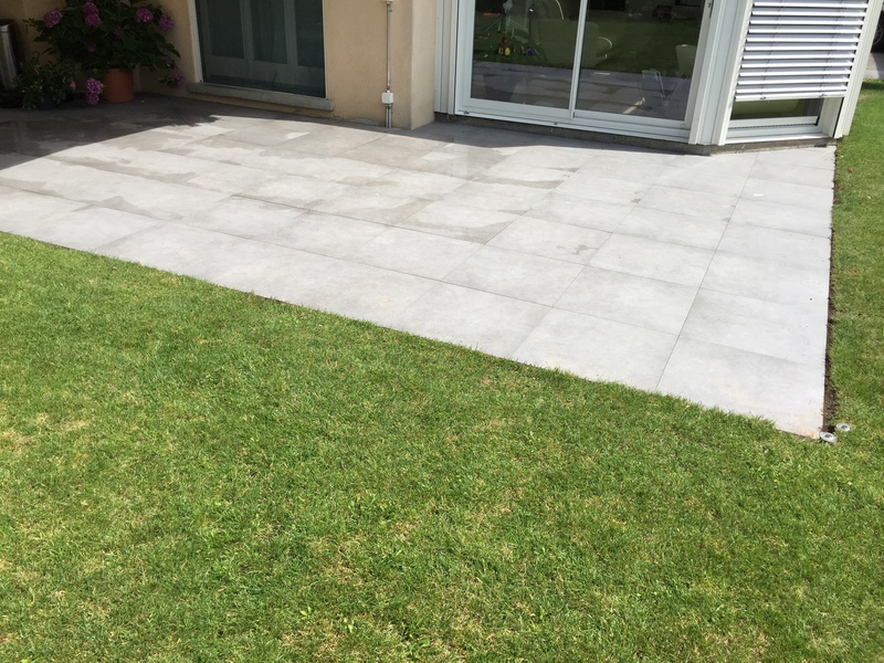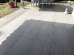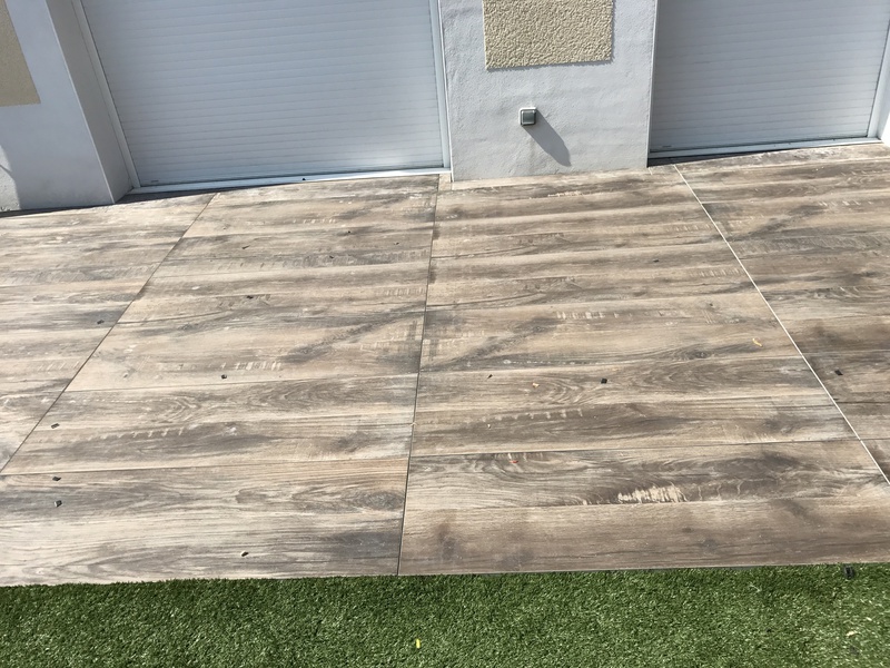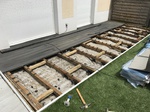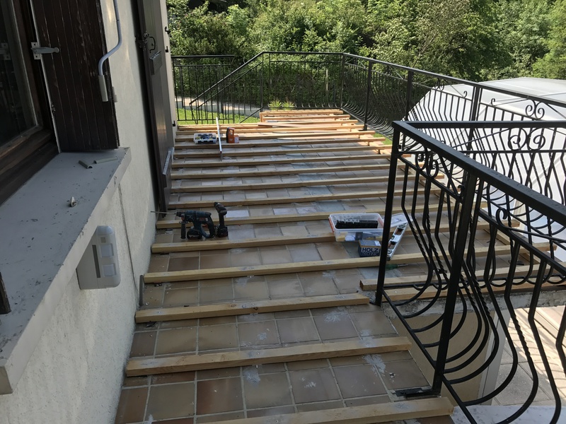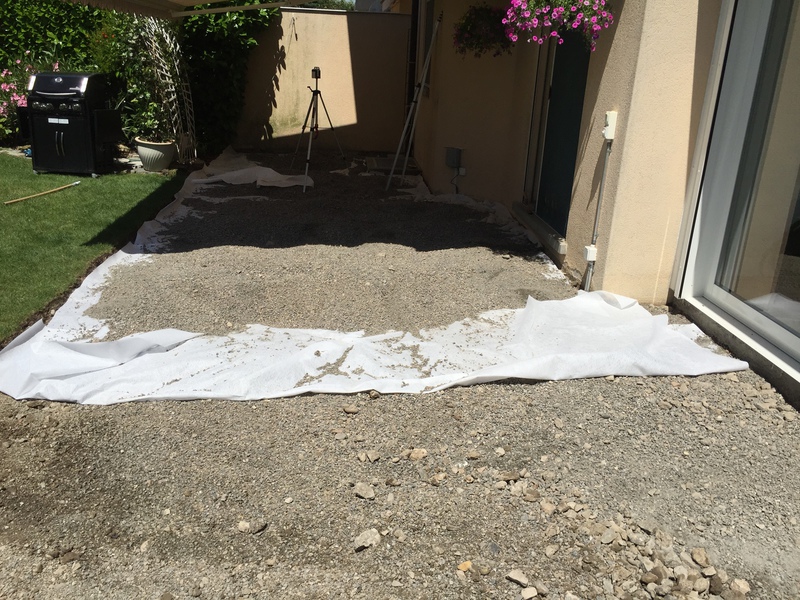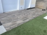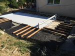 PVC, montage et pose de meubles de cuisine. Pose de dalles de terrasse en pierre sur lit de gravier. Pose de lames bois composite sur ancienne terrasse béton autour d'une maison.
